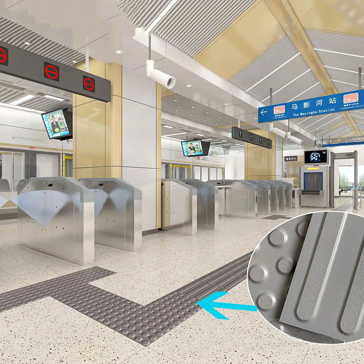 - 行進盲道(條形磚):縱向紋路引導直行,貫穿出入口通道、扶梯/電梯入口,避免繞行障礙;